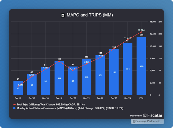 MAPCs (Reach): Horizontal growth. More unique users = a larger capital pool. Trips (Frequency): Vertical growth. Increased engagement per user (e.g., from 4 to 6 trips/month) drives efficiency.