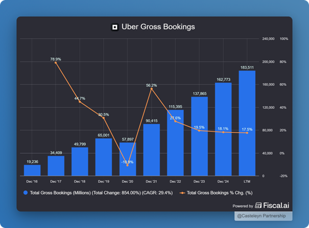 Uber operates an asset-light model. For every transaction, Uber collects a service fee (the “take rate”), typically between 20-30%, in exchange for providing the 1) technological infrastructure, 2) payment processing, and 3) marketing.