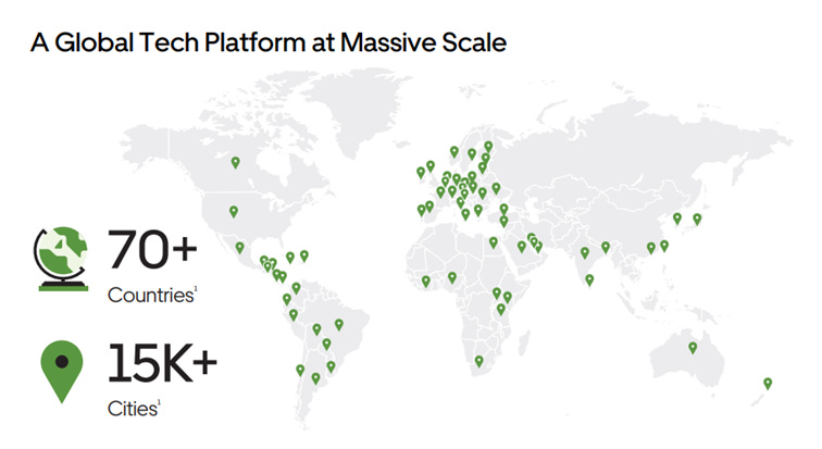 Uber operates globally. It services approximately 15,000 cities worldwide, in more than 70 countries:
