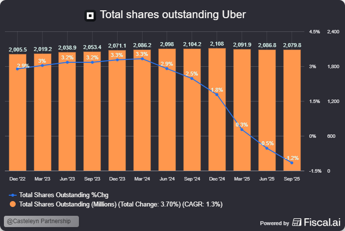 We focus on Quality Growth. We do not look for companies that happen to be worth slightly more tomorrow, but for the ‘compounders’ of the future. We prefer companies where the founder is still in charge or where management holds a significant portion of their own net worth in shares. Their interests must run parallel to ours. This is the case for Uber. Additionally, management comes across as having high integrity and in our eyes, management has more and more to prove as true capital allocators. However, as stated in 6.5 Management Conclusion: Casteleyn Partnership, we have been following the company for too short a period to draw definitive conclusions about management. We want to be able to evaluate management over a longer period of time, but at first glance, it looks positive.