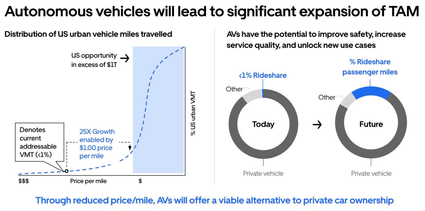 Uber relies on partners like Waymo and other players for self-driving technology, which poses a strategic risk if these partners operate their own networks independently of Uber. If competitors roll out a safe AV network faster, Uber will lose its position as an aggregator of human drivers.